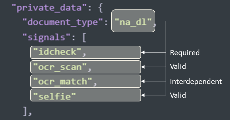 To understand whether a private_data object is correct, first consider the document_type. Then make sure the required signal is included. Then evaluate the remaining signals.